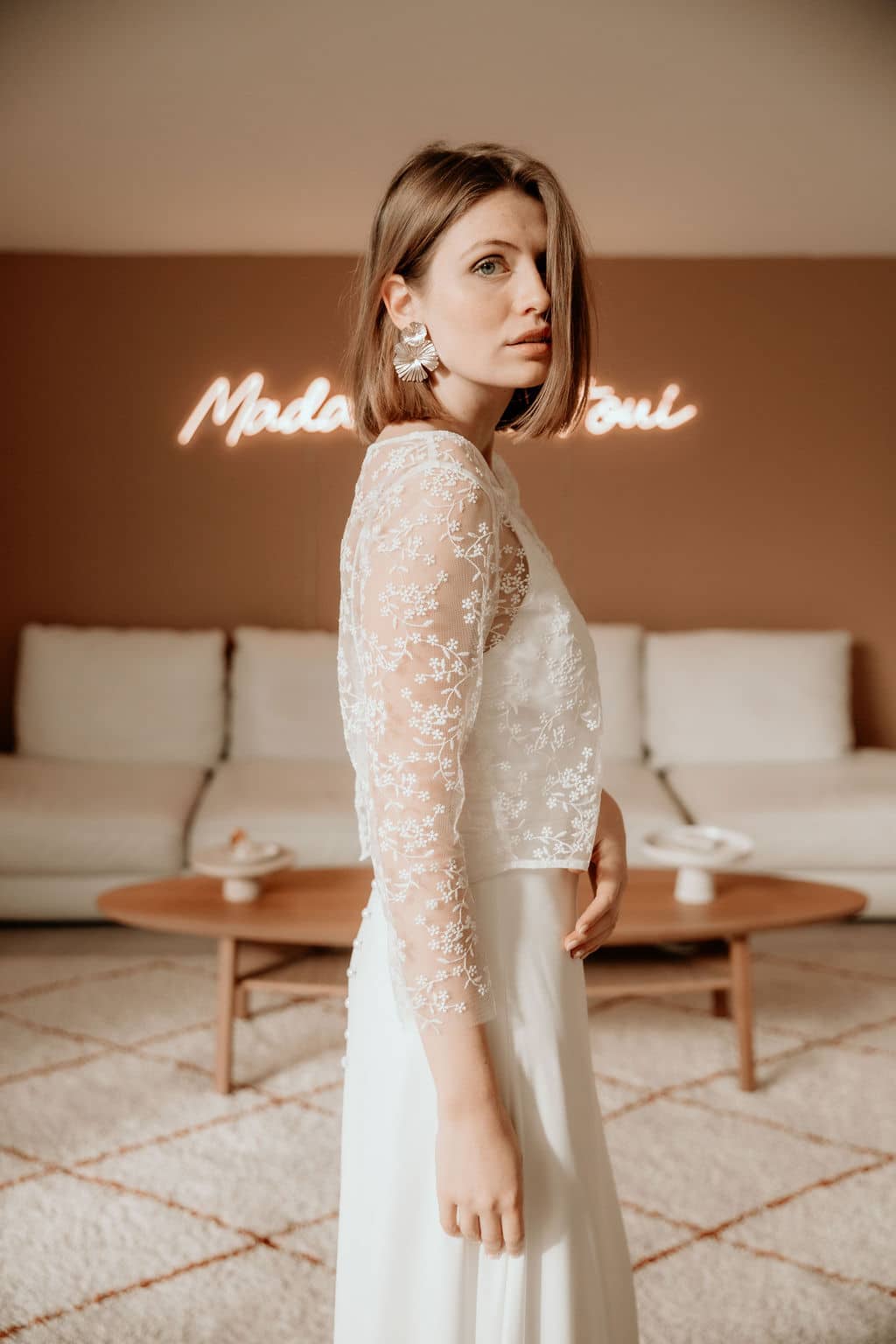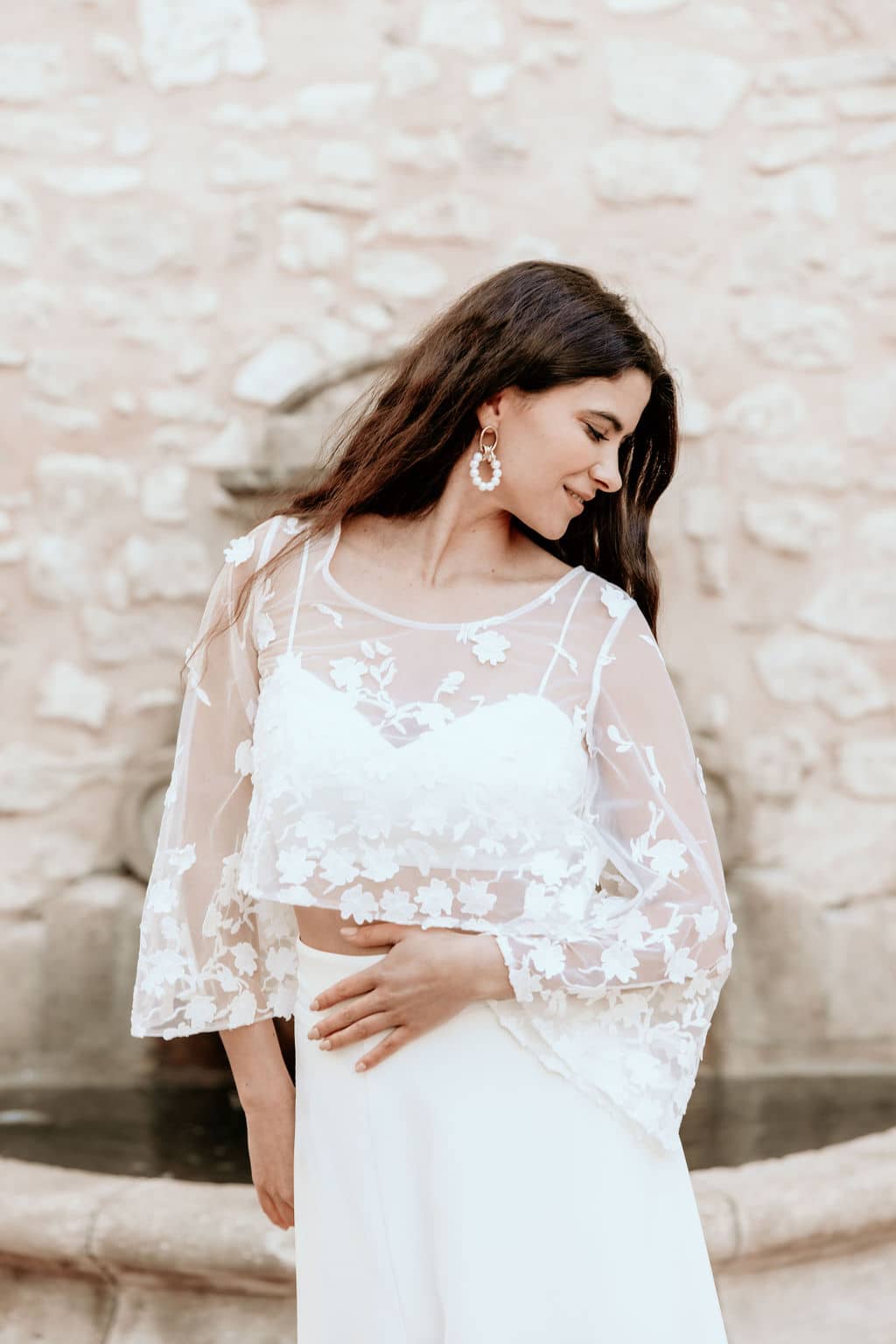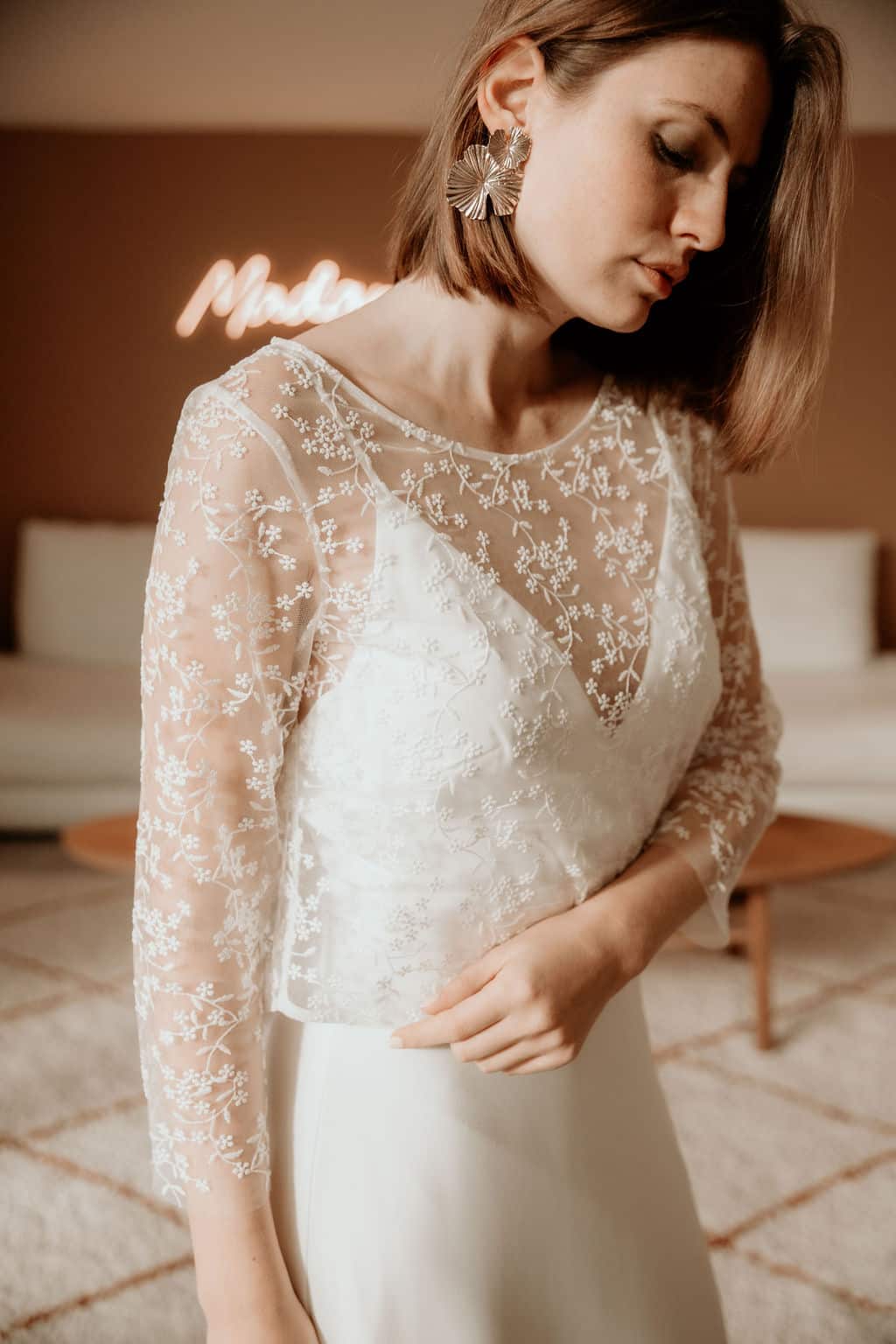 Nous apprécions particulièrement la jolie dentelle Lili et son délicat jeux de transparence présent sur le cache-cœur à manches longues, le boléro à manches courtes et une petite robe civil courte prénommée Blanche. Vous trouverez également chez nous quelques toppers à paillettes et des châles ou petites vestes/bombers pour compléter votre tenue du jour J !