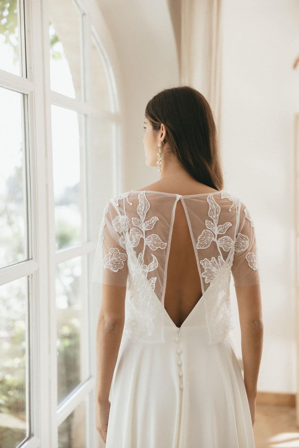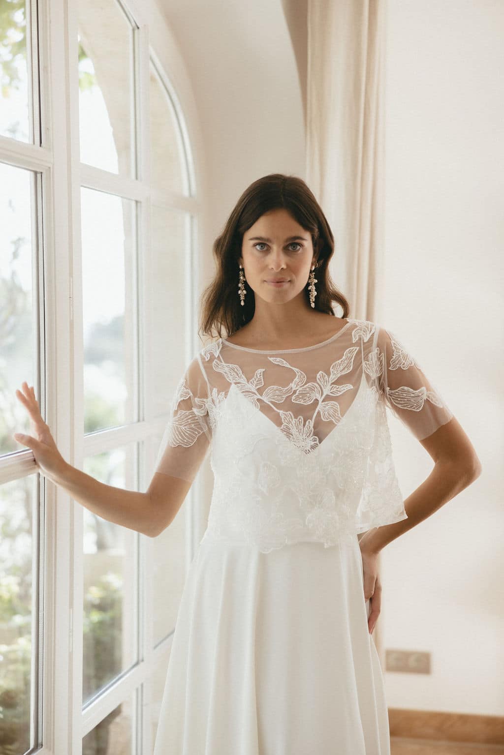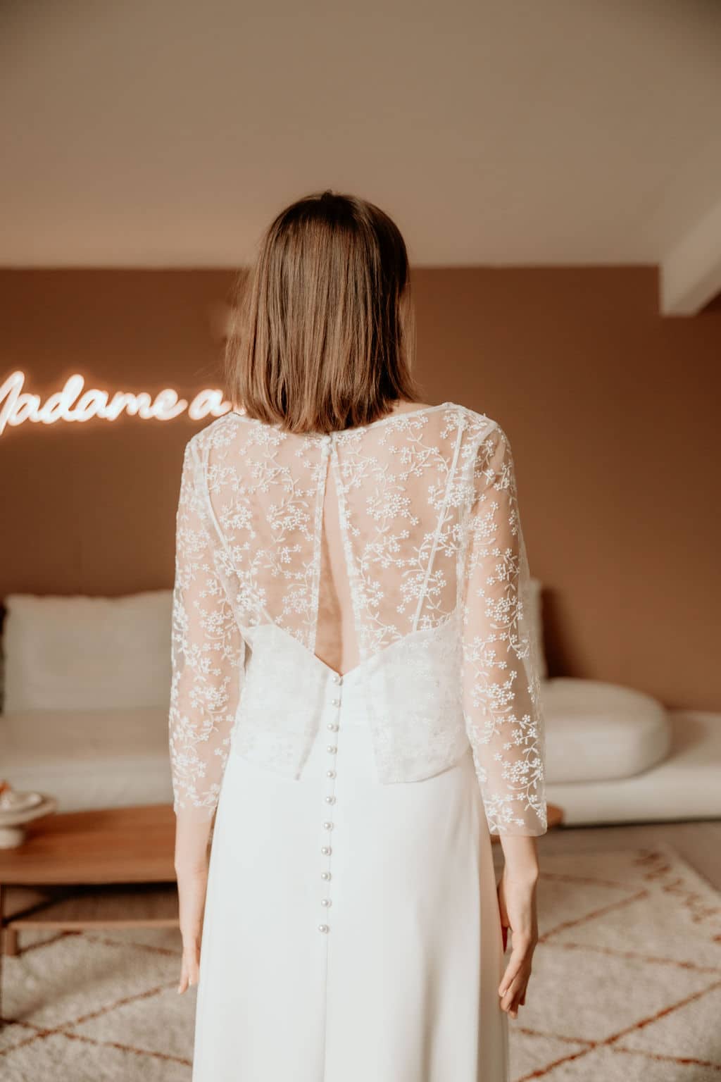 Nous apprécions particulièrement la jolie dentelle Lili et son délicat jeux de transparence présent sur le cache-cœur à manches longues, le boléro à manches courtes et une petite robe civil courte prénommée Blanche. Vous trouverez également chez nous quelques toppers à paillettes et des châles ou petites vestes/bombers pour compléter votre tenue du jour J !